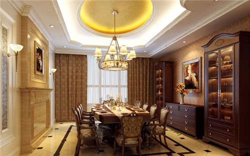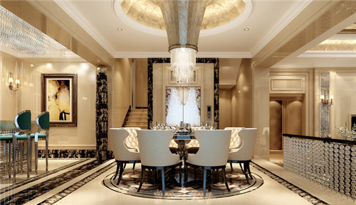 别墅餐厅装修设计中,照明一般以吊灯为主,这里的灯光最好选用柔和灯光,这样可以增加就餐的温馨气氛。这个安装位置需要注意,不建议直接照射在就餐人的头部,不仅不雅观,而且会给人带来压抑感。