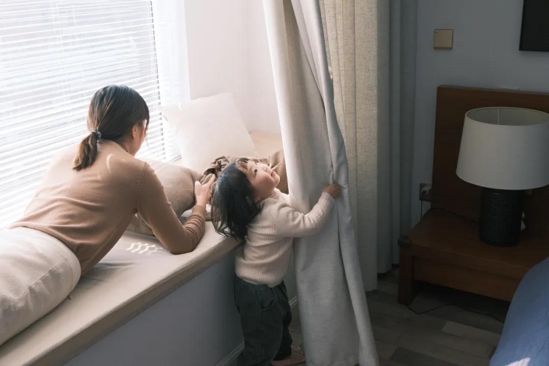 比如我家儿童房的儿童床是靠窗摆的,如果窗帘靠墙安装就会出现窗帘被床夹住难以拉动的情况。