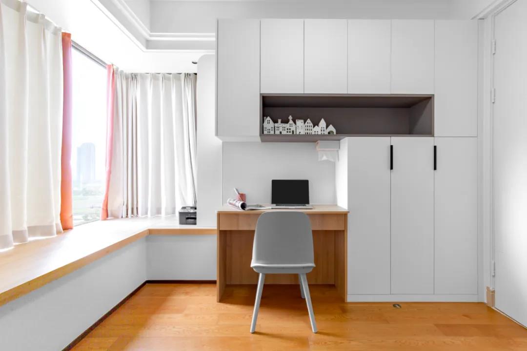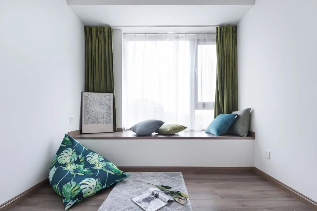 一字型的飘窗,相对来说窗帘的安装比较自由,基本窗帘布帘靠窗安装就能实现很好的遮光效果,而且窗帘对家具布置摆设也不会有什么影响。