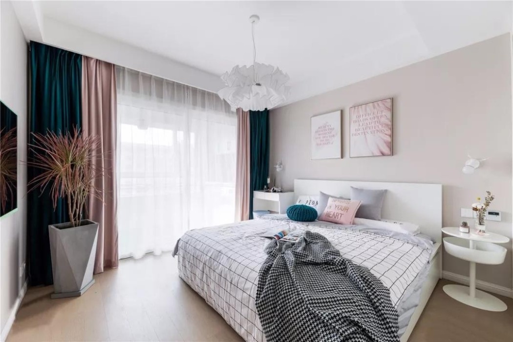4、宽大的落地窗户,落地窗帘,阳光可以透过玻璃大面积的照进室内,整个简欧卧室中就充满了阳光。吊顶采用了巨大的圆盘设计,加之背景墙的艺术画,让整个卧室充满了时尚艺术气息。