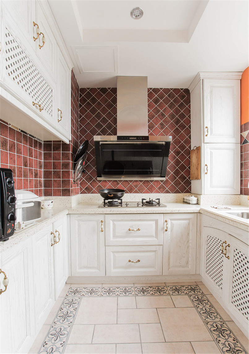 1、花砖,并不是说花图案的瓷砖,而是那种有着几何图案的瓷砖。这类瓷砖色彩丰富,有黑白色、蓝白色、灰黑色等,非常有个性且视觉效果极强,尤其是那些冷色调的配色,可以很好的吸收厨房热量,让你的厨房看起来与众不同。