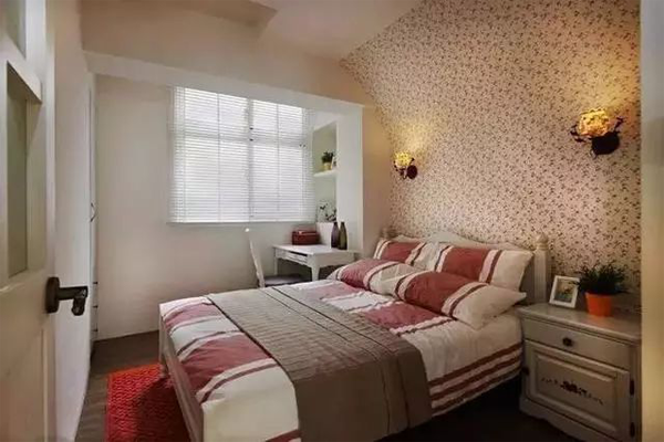 要的是营造清新自然之感。这款卧室以小红碎花墙布搭配红白相间的床品,带来了活泼自在的气息。