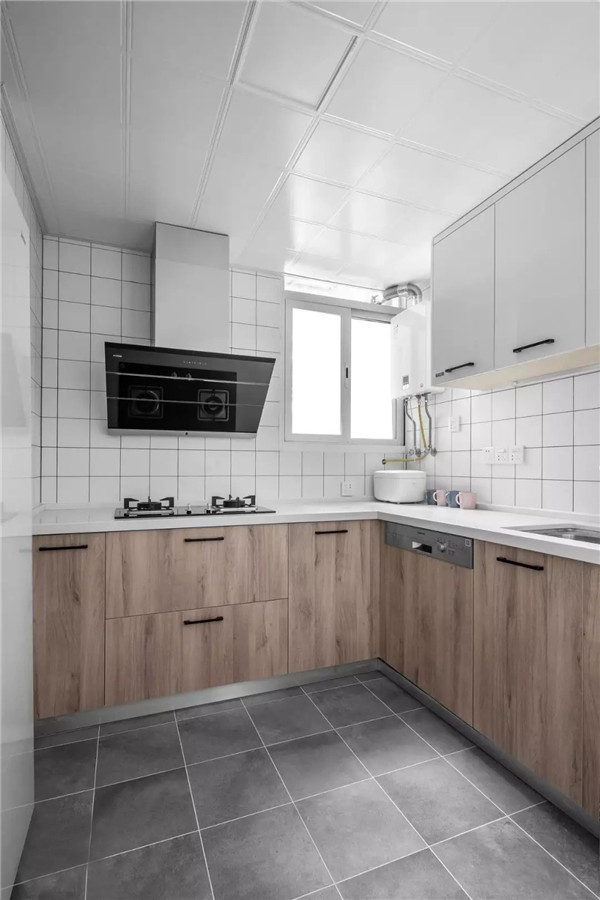 将原来很小的生活阳台也加入,增加为厨房空间。大片的白色瓷砖,也让只有一小扇窗户的厨房明亮起来。