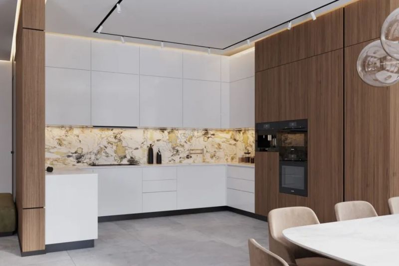 140平米三居室现代简约风格U型厨房橱柜装修设计图