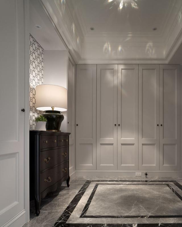 玄关区,首先映入眼帘的是经典美式风格的抽屉柜,深棕色的柜体厚重沉稳,搭配墙上的特色壁纸,一股浓浓的美式风格扑面而来。在玄关区设计师设计了大片的白色收纳柜体,创造了充足的收纳空间,矩形样式的柜门干净利落,铺垫出房间的主色调。