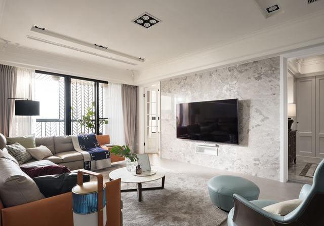 客厅区域,电视主墙运用浅灰大理石铺满墙面,在电视下面设计壁龛式收纳空间,在自然光照射下,突显清爽、自然的特质。沙发背墙大片留白与餐厅设计窗户隔断,能让采光互相借鉴,丰富视觉层次。棕色宽大的皮质沙发是美式风格家具的典型代表。