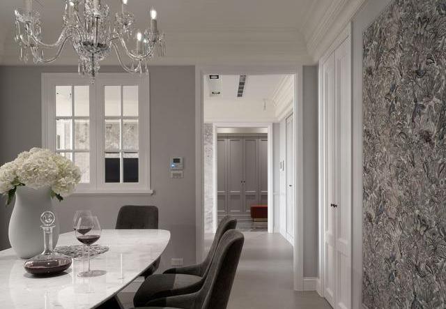 厨房里水晶吊灯格外显眼,突出轻奢氛围,深色的纹理墙面装饰以及大理石餐桌使空间更加富有立体感。厨房仍然采用雅致的白色为主色调,白色的橱柜搭配电器的黑色面板,在美式风格中加入了现代气息。