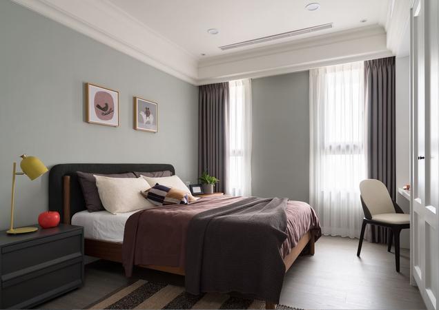 主卧床背墙采用大地色系的涂料涂刷,搭配宽大柔软的床头描绘沉稳舒适的休息空间,卧室家具仍然采用白色,呼应空间主色调,在靠窗位置设计小卧榻,在增加收纳空间的同时使主卧室更富有生活情趣。