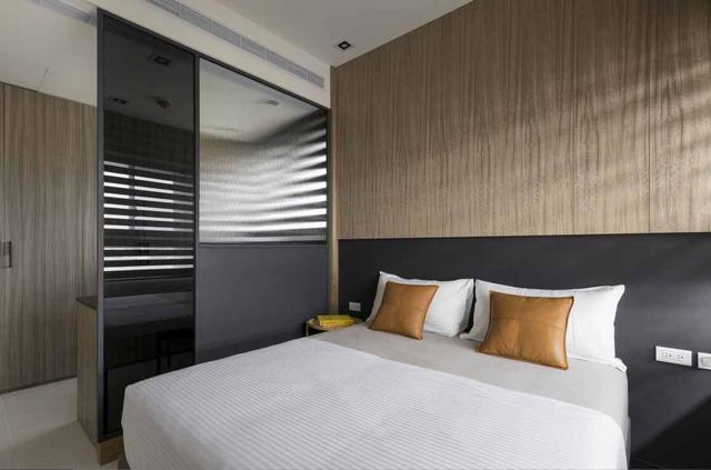 这一间是主卧,主卧背景墙做了护墙板设计,主卧有一个设计亮点,那就是卧室用铝合金玻璃隔断,隔出了一个小小的书房,用玻璃来当隔断,更加节省空间,一间房改成两间房!