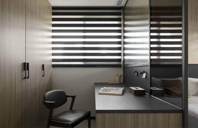 这一个小小的空间,就改造成工作区了,摆放一张小书桌,平时就可以在这里办公了,背后是到顶的大衣柜,木色纹理的门板,和卧室的其它家具颜色风格都很一致。