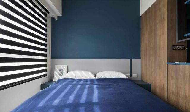 下面这一张是次卧,次卧的空间也比较紧凑,颜色方面也是局部搭配了蓝色,视觉上看起来显得空间宽敞一些,另外窗帘选用百叶帘,白天光线透进来,空间通透明亮!