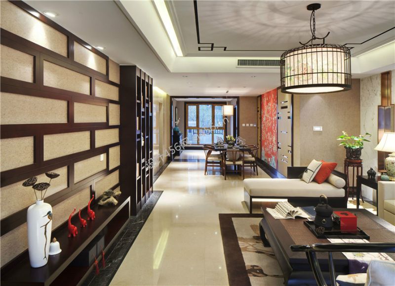 155㎡新中式风格三室两厅客厅背景墙装修案例