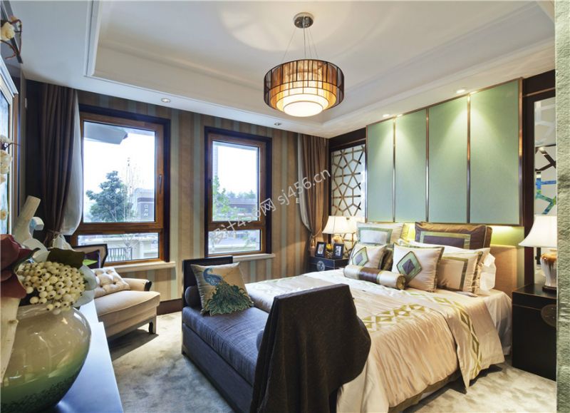 155㎡三室两厅新中式风格主卧室床尾凳案例