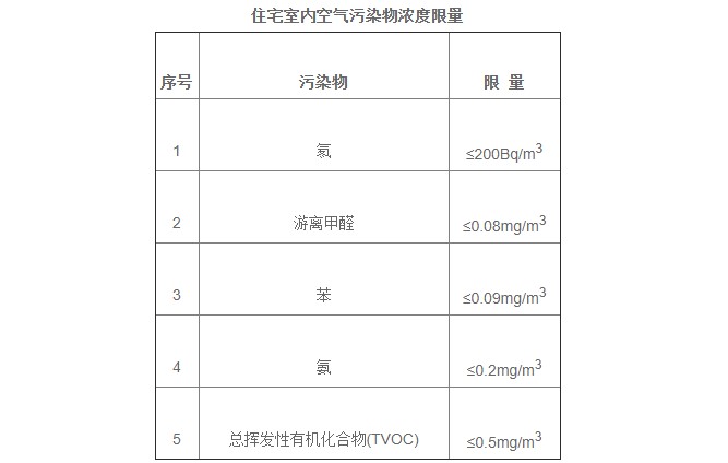 室内环境污染物包括室内氡浓度、游离甲醛浓度、苯浓度、氨浓度、TVOC浓度不能超过国 家现行相关标准的规定。