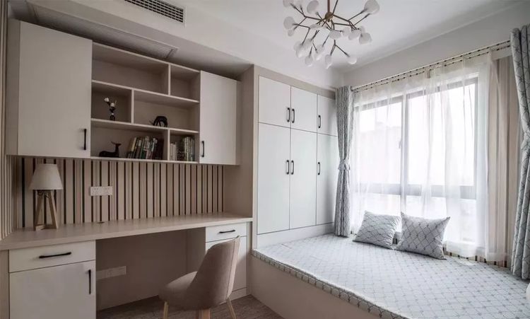 书房装的是定制家具,装了个榻榻米并延伸出一张书桌,这样既可当卧室用又可当书房用。