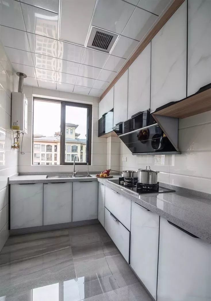 厨房安装的整体橱柜,采用了L型布置,吊柜与地柜装得满满的,可让厨房收拾起来干净整洁。