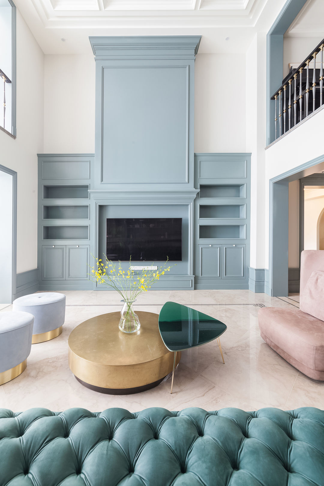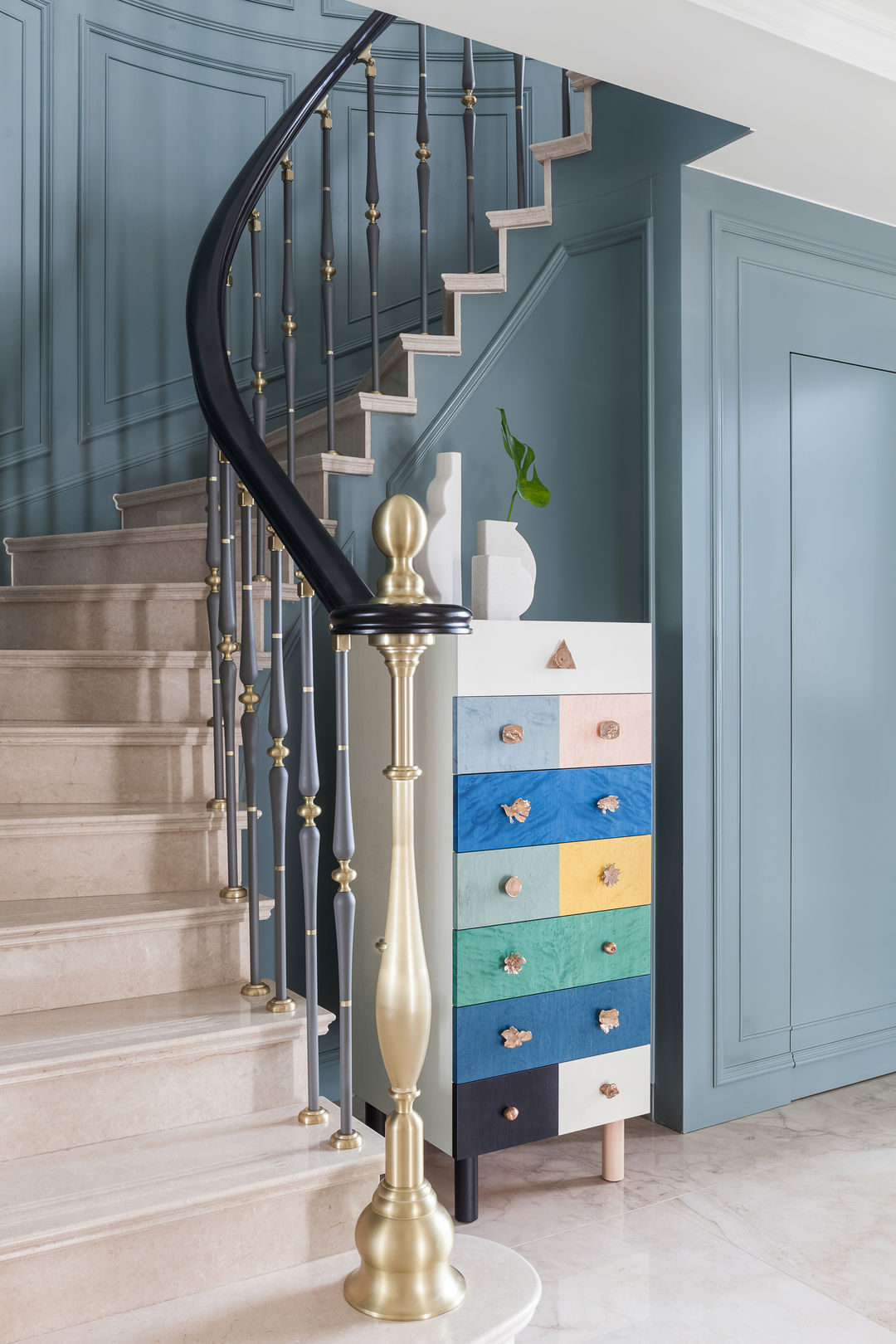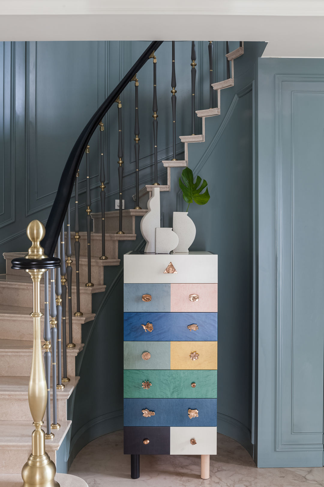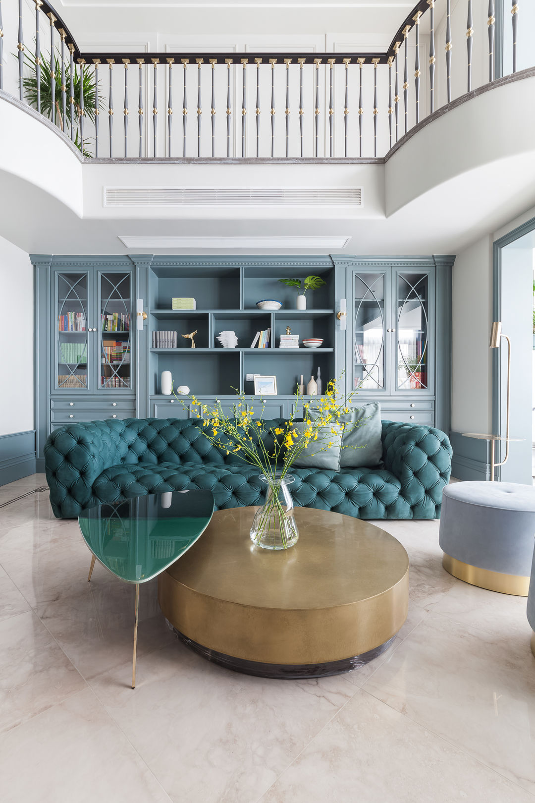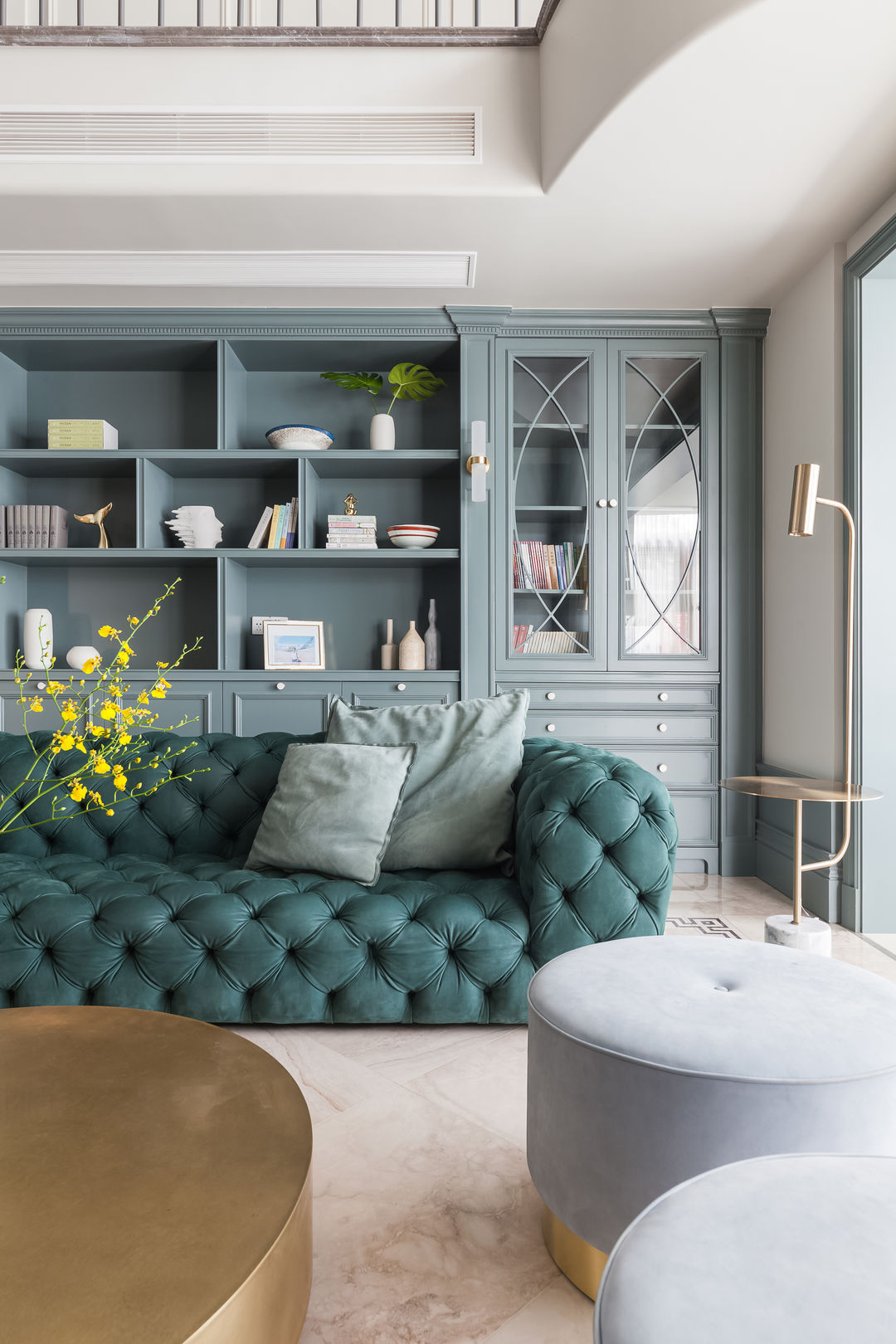 我们以绿灰的主色调加入一些现代感的轻奢元素,汲取美式中温情的部分,摈弃过于厚重怀旧的形体表现,用优雅的现代美式来打造这套复式叠墅。