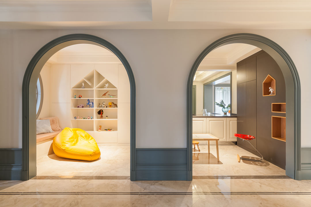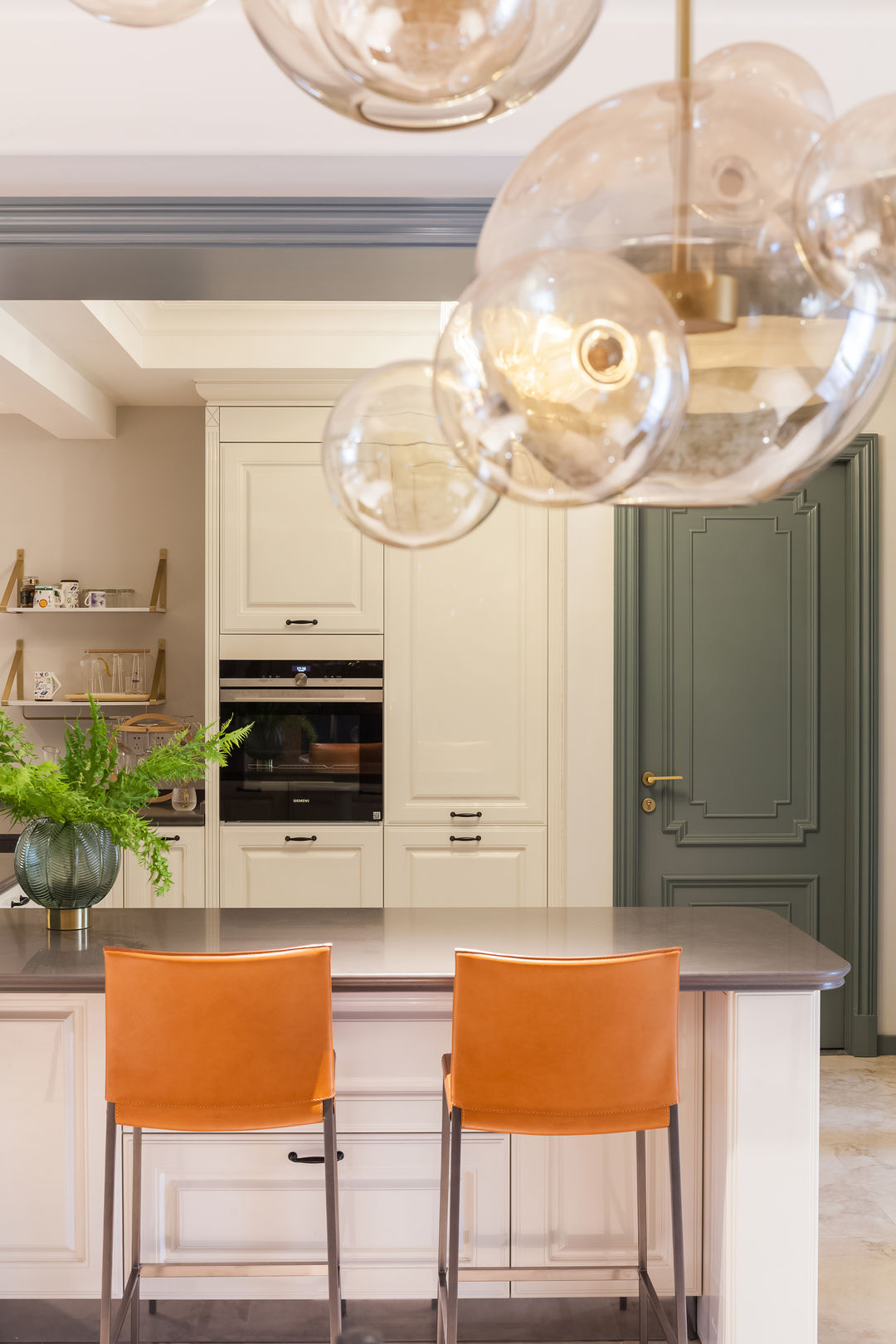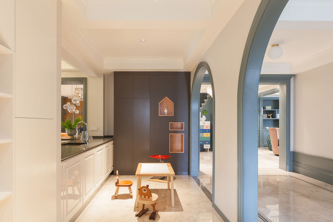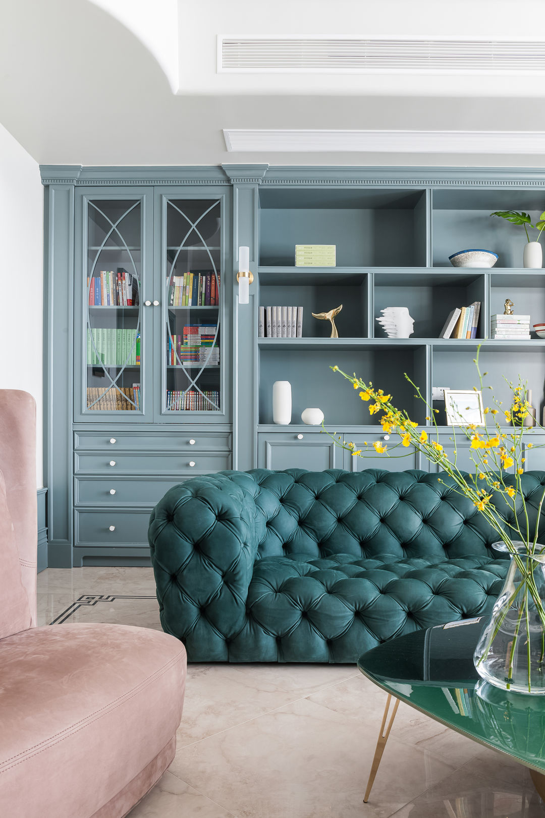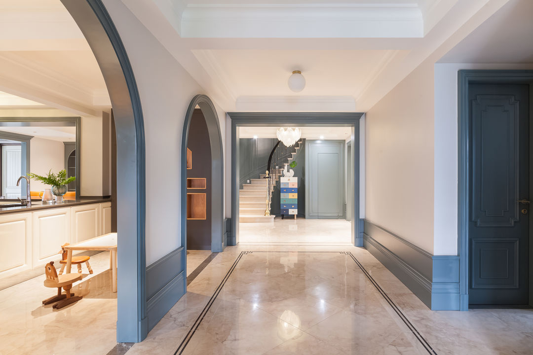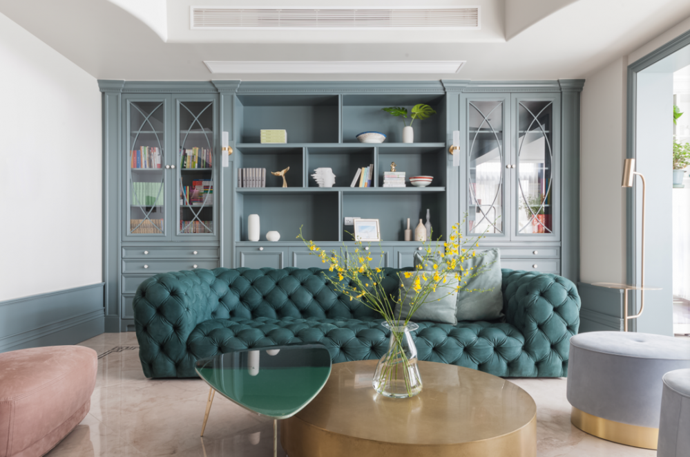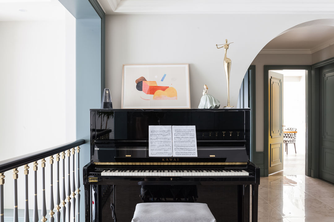 我们以绿灰的主色调加入一些现代感的轻奢元素,汲取美式中温情的部分,摈弃过于厚重怀旧的形体表现,用优雅的现代美式来打造这套复式叠墅。
