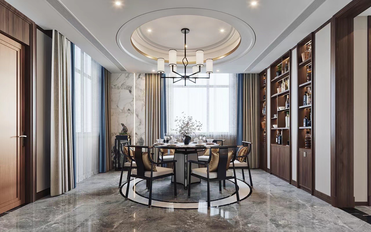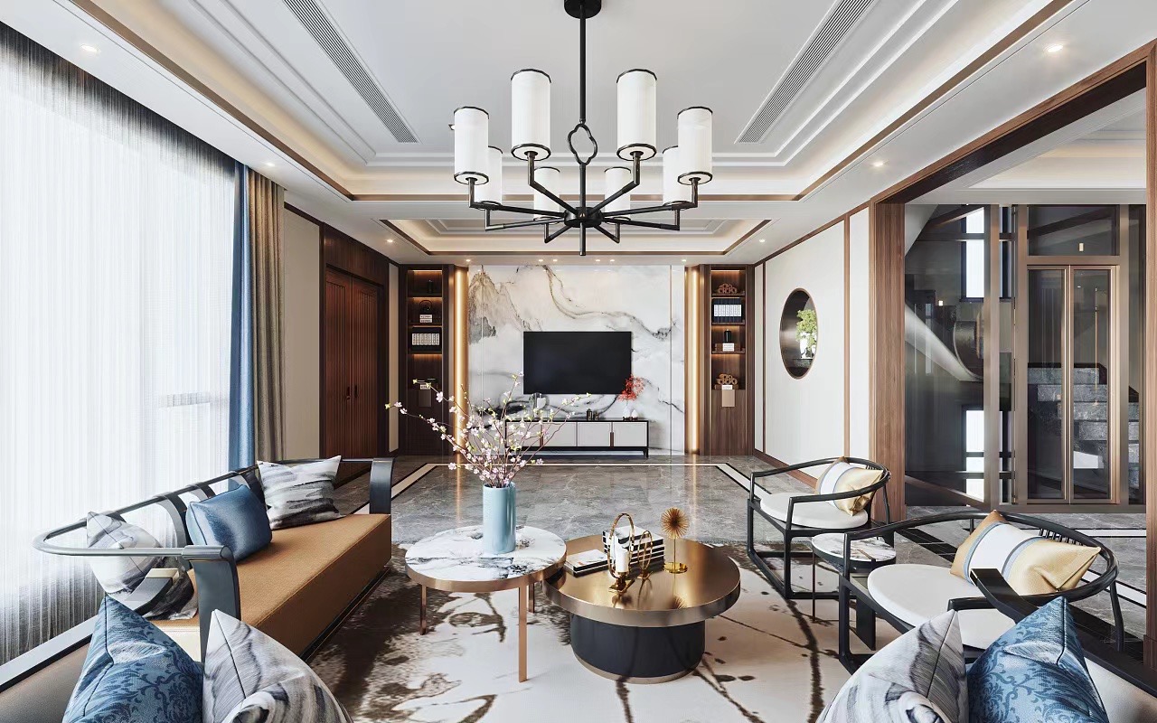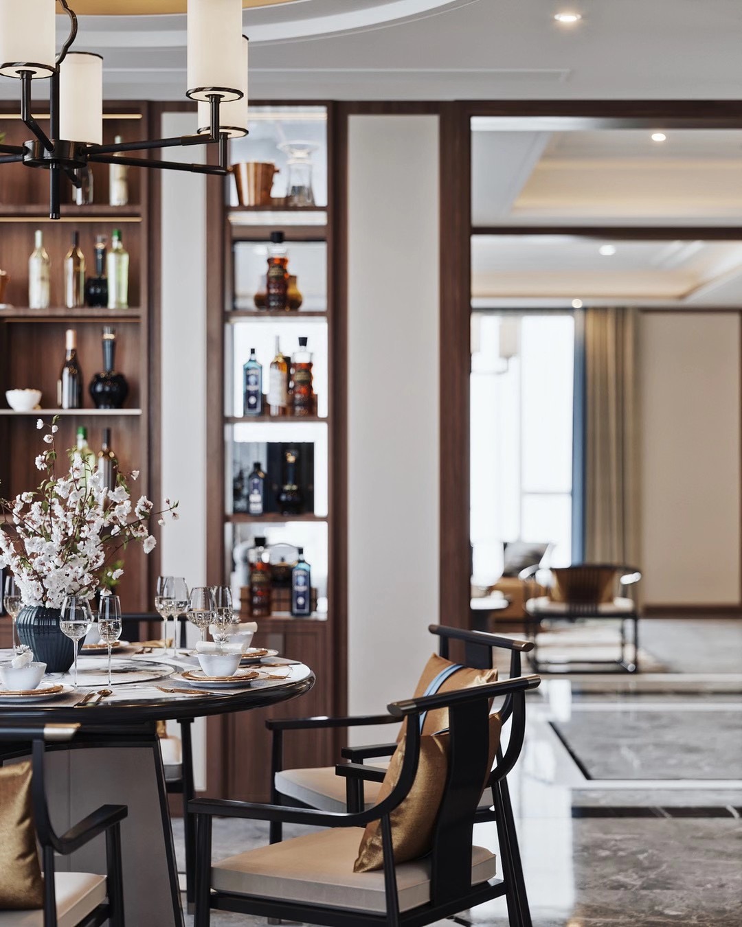 新中式风格有很强的中国文化特色,也适合现代人的生活环境,整体感觉典雅,庄重,已被大多数年轻人喜欢和接受。本案依附于简约设计的形式,选用现代精益求精的细节与华丽的配饰,却将影视墙、摆设、屏风等中式元素的神韵贯穿在整体空间中。