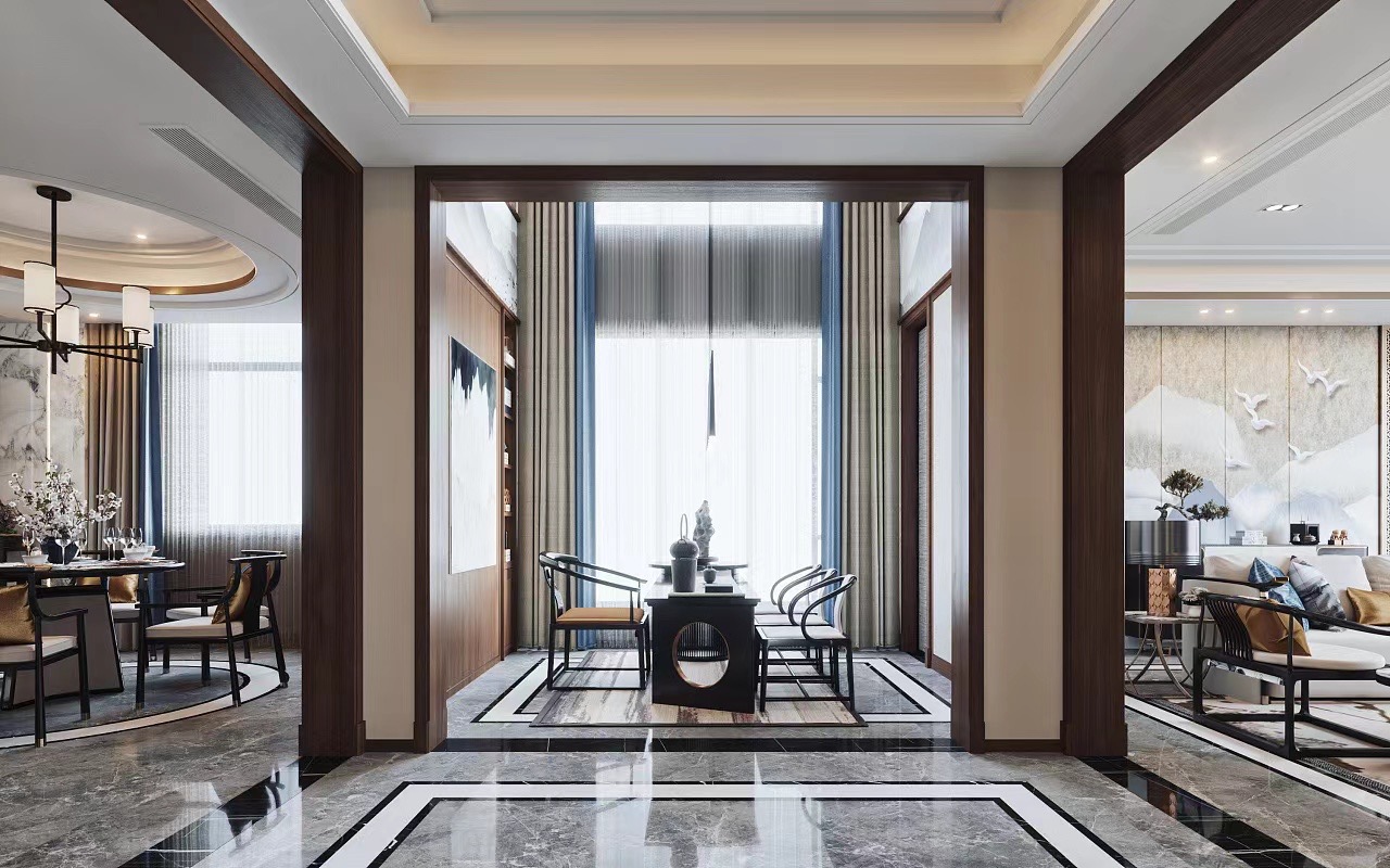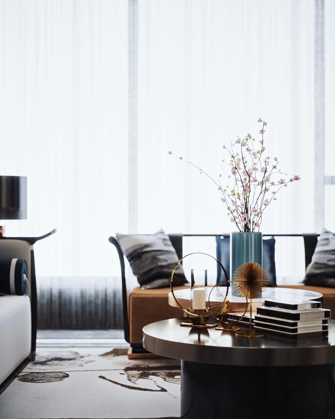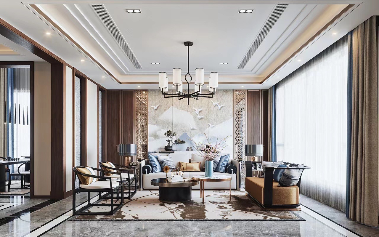 新中式风格有很强的中国文化特色,也适合现代人的生活环境,整体感觉典雅,庄重,已被大多数年轻人喜欢和接受。本案依附于简约设计的形式,选用现代精益求精的细节与华丽的配饰,却将影视墙、摆设、屏风等中式元素的神韵贯穿在整体空间中。