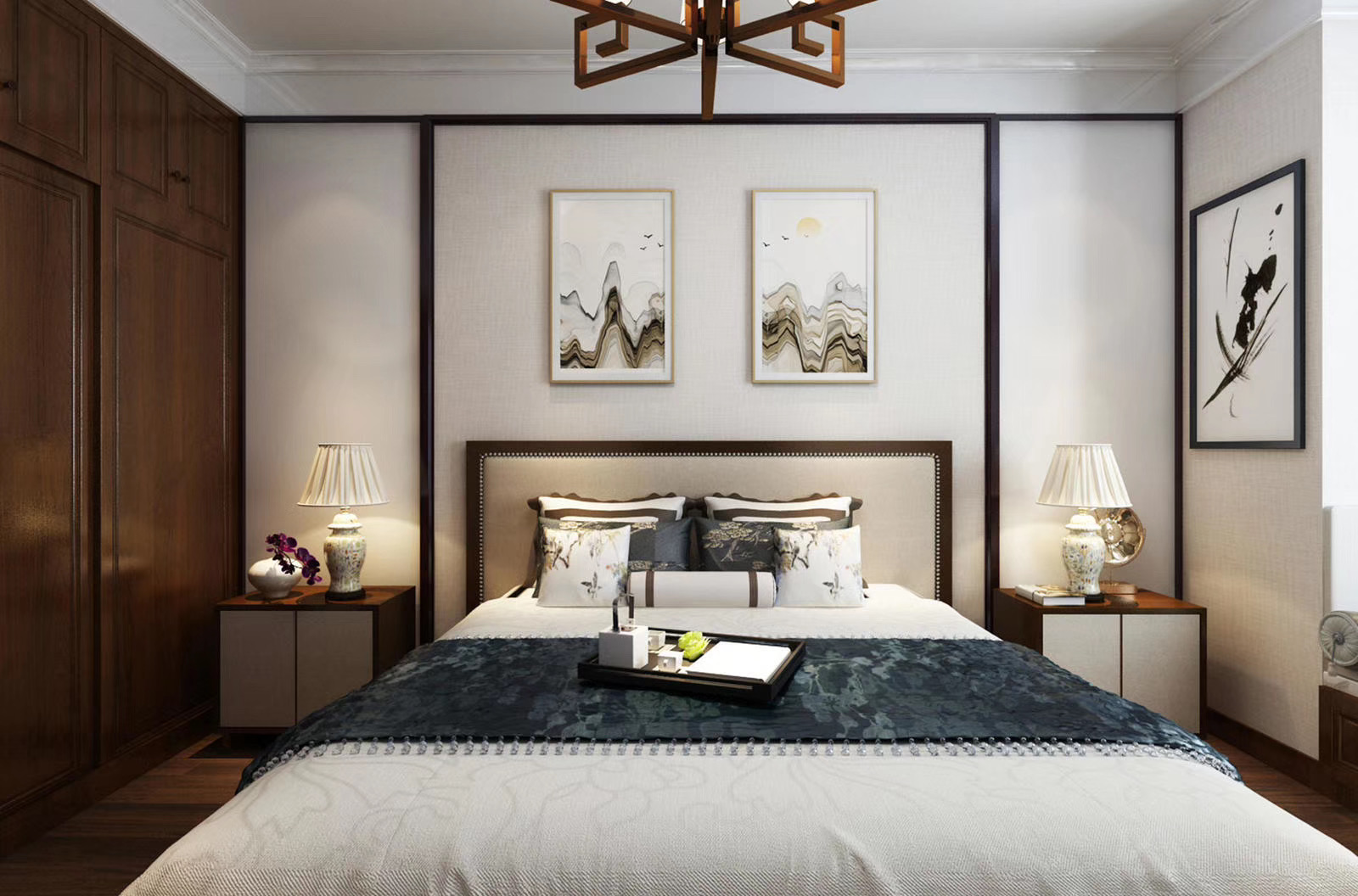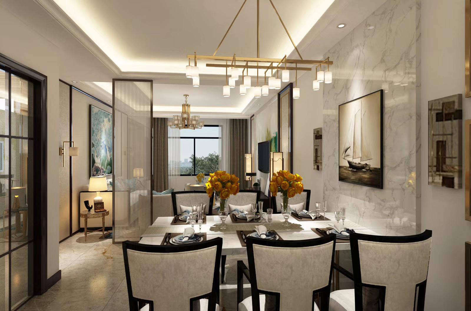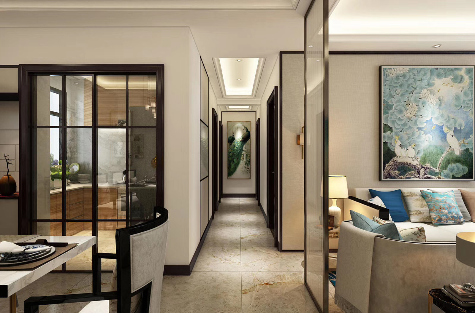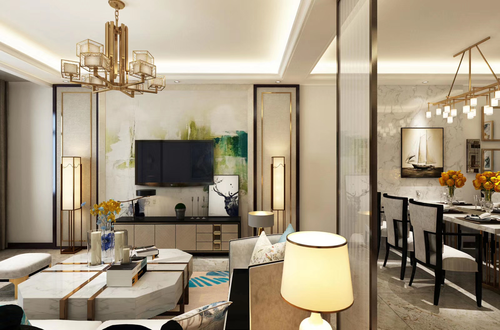 轻奢并不是搭配许多昂贵的装饰品,而是删繁就简,通过金色金属条和背景墙块面,形成线条呼应,以线条衬托现代,用金属表现轻奢;这套作品里主要运用莫兰迪色系配色,大胆使用暖色和冷色的搭配,不限于单色配色。