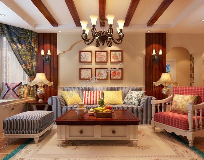 详情田园风格120㎡三居客厅沙发背景墙家装效果图