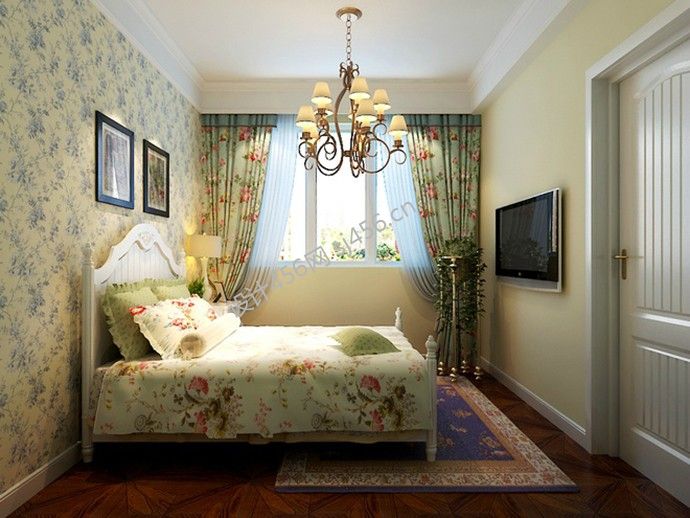 田园风格120㎡三居卧室背景墙家装效果图