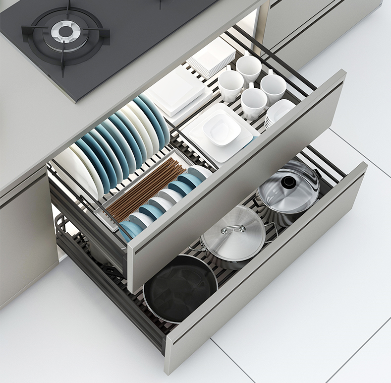 ▲抽屉长且厚,更推荐抽屉收纳物品也是有优先级的,优先考虑收纳小件或者易碎物品,比如碗筷、盘子。而一些体积稍大的锅具、盆。完全可以考虑用收纳盒、撑杆代替,不必耿耿于怀必须装满抽屉。