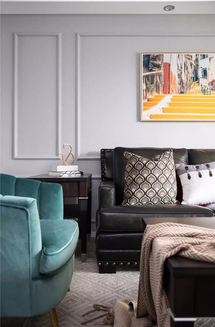 ▲ 亮眼的装饰画、金色元素的灯具及装饰摆件,增加了空间的时尚感。整体设计既带有美式的优雅细腻,又带有屋主想要的现代时尚感。