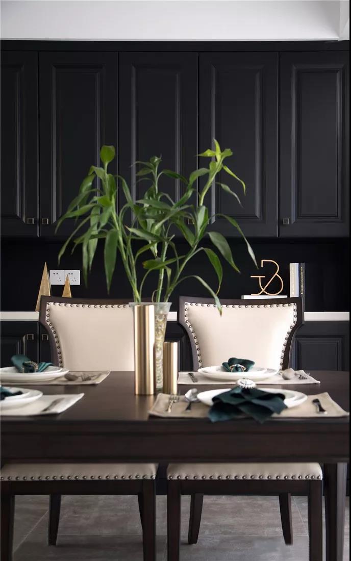 ▲ 餐厅整面的餐边柜满足屋主收纳需求,定制柜子的光泽质感使之不显压抑,美式餐桌椅也让整块区域布满精致气息。