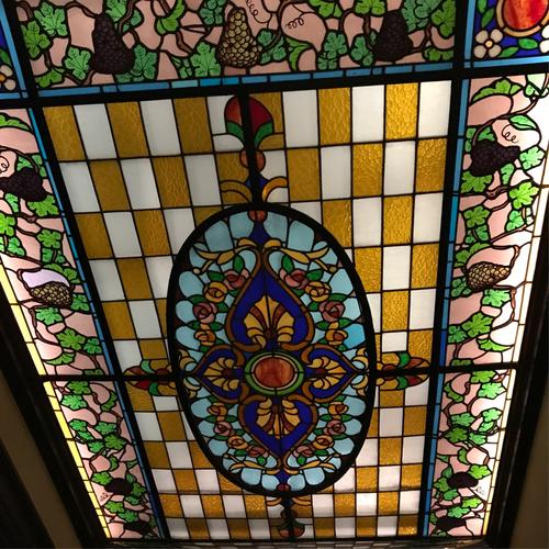彩绘玻璃是以颜料直接绘于玻璃上,再烧烤完成,再利用灯光折射出彩色的美感。其多种图案,可作内部照明。但这种材料只用于局部装饰,否则就像基督教的教堂了。