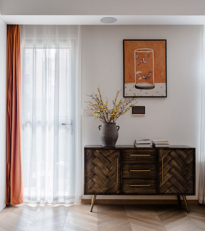 设计理念: 客厅采用实木地板,窗帘与壁画的色彩,为整体空间增添了活力 客厅采用实木地板,窗帘与壁画的色彩,为整体空间增添了活力
