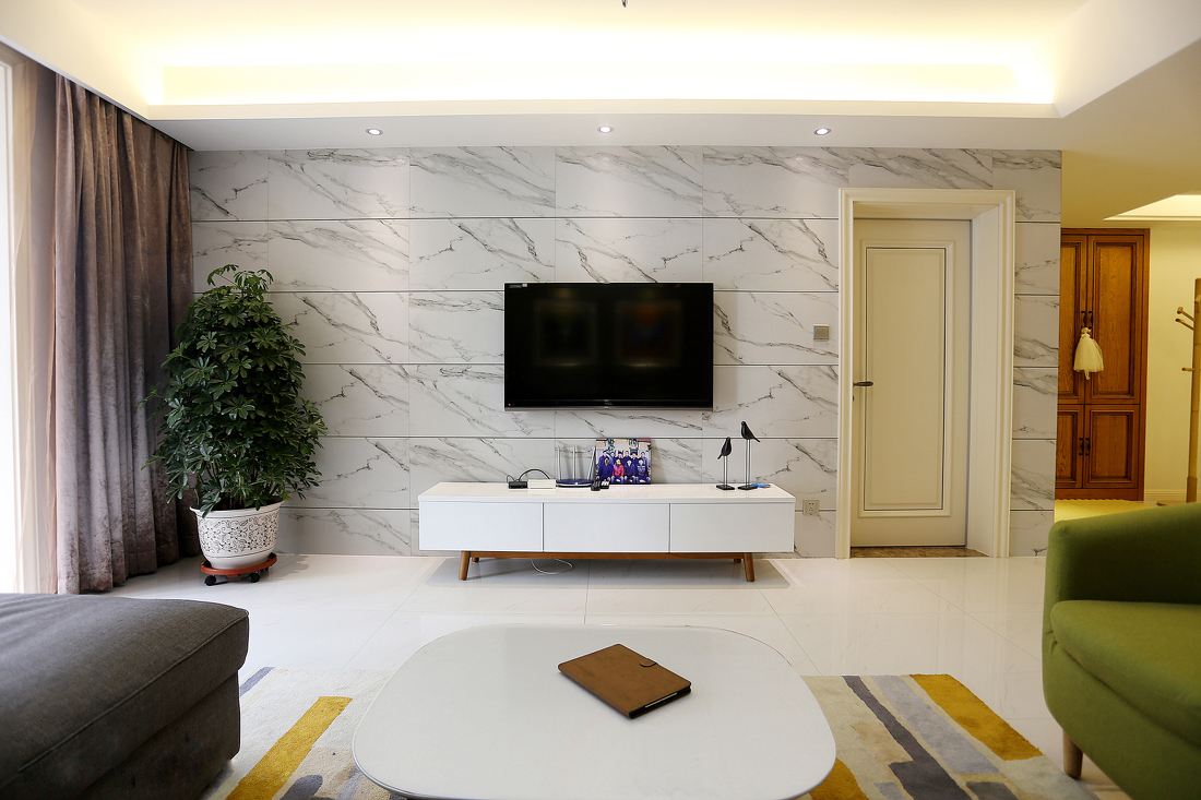 若是用深色的吊顶会显得天花板过于厚重,就像头顶乌云,异常压抑。而浅色系给人的视觉效果更为轻盈。通常室内装修,从垂直角度上讲究自下而上,由深到浅。因此吊顶比较适合用白色、浅黄色、浅灰色等等。墙裙也是如此,而踢脚线位于室内下层区域,建议选用较为深深色系的颜色。这样的色彩搭配,打造了轻松的稳定感,视觉效果也更加舒适。