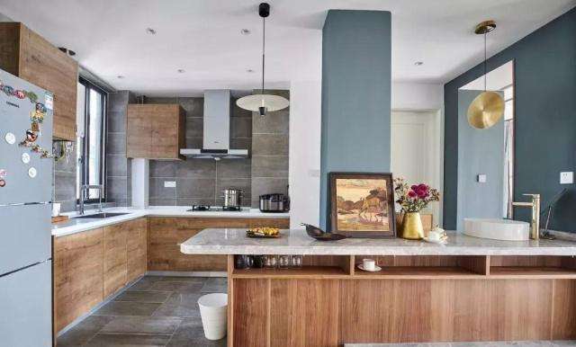 1、聊天、吃饭、聚会的好场所;厨房正中间的不规则吧台可以承担很多功能,这个定制的吧台其实功能还不局限于此。在清晨时分,这里是主人做好早餐,并看报的地方;在用餐时分,这里又是餐桌;而在朋友来聚会的时候,吧台下方的储酒区又发挥了作用,朋友随意地在这里坐坐,喝着酒聊聊天。原来,厨房的功能并不局限于烹饪,可以满足各种功能。