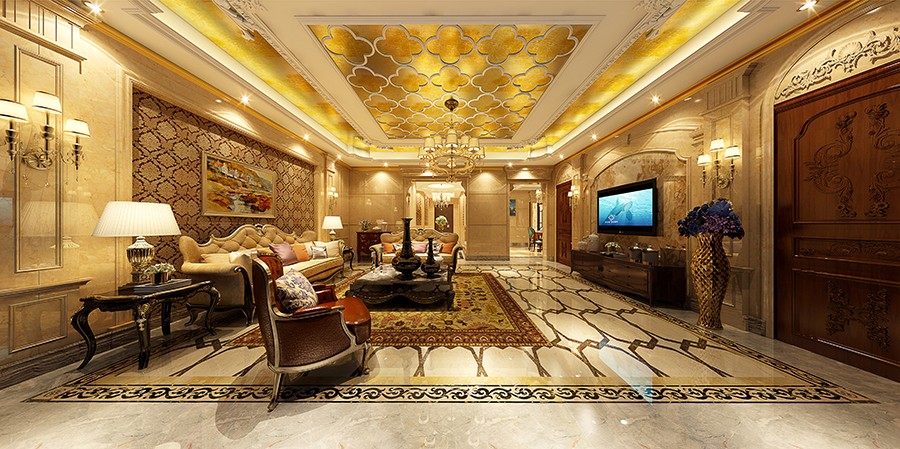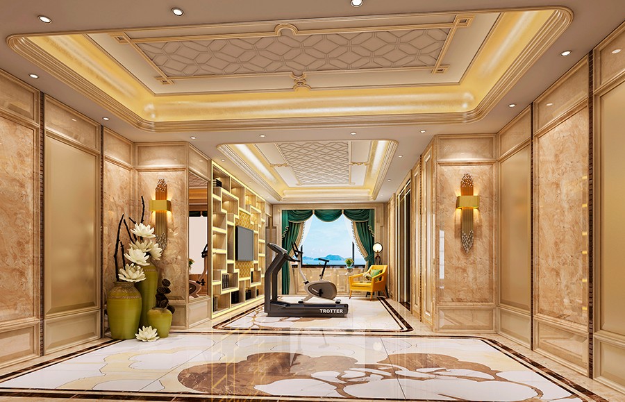 米黄大理石饰面,罗马柱式体现空间单体层次感,以米黄色木饰面跟墙布为主,稳重端庄而又不失自然舒适。大空间以米黄色为主线,在家具上建议采用樱桃木或桃花芯木等高档实木,表现出高贵儒雅的贵族气质。