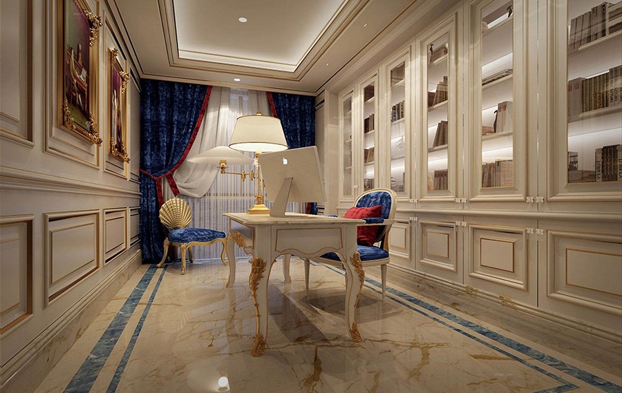 欧式镶金线条、象牙白家具带金色雕花手边,面板可选珍珠漆或原木色,书柜功能性强,现高雅特性,白色珍珠漆调和线条复杂性。书柜个性尽显客户生活品味和性格。