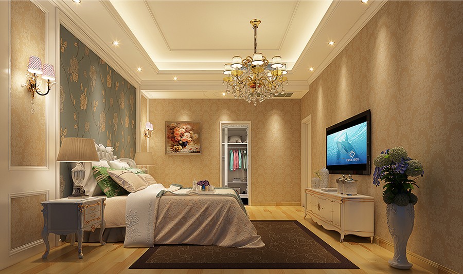 简洁的墙面造型,搭配传统欧式水晶灯,米黄色墙布凸显温馨感。在长辈房中,简洁而不失雍容华贵。