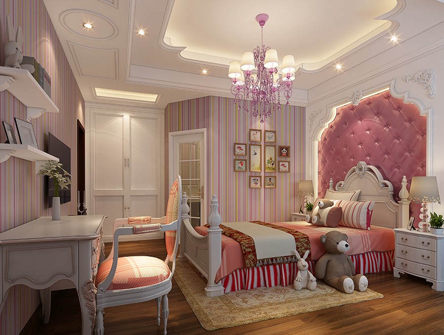欧式线条、古典家私,女孩房墙布应用粉色条纹墙布,营造一种天真活泼的少女心。