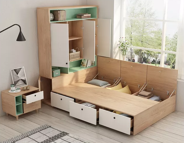 在连小卧室都算不上的时候,可以把榻榻米做成地台的样子,上面可以成为孩子玩耍的地方。整个地面都可以布满地柜,在用合适尺寸的收纳箱,就可以把地面空间充分利用起来。墙面上也可以安装隔板来进行其他收纳。