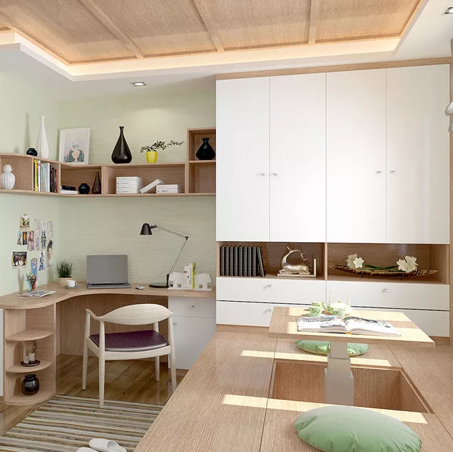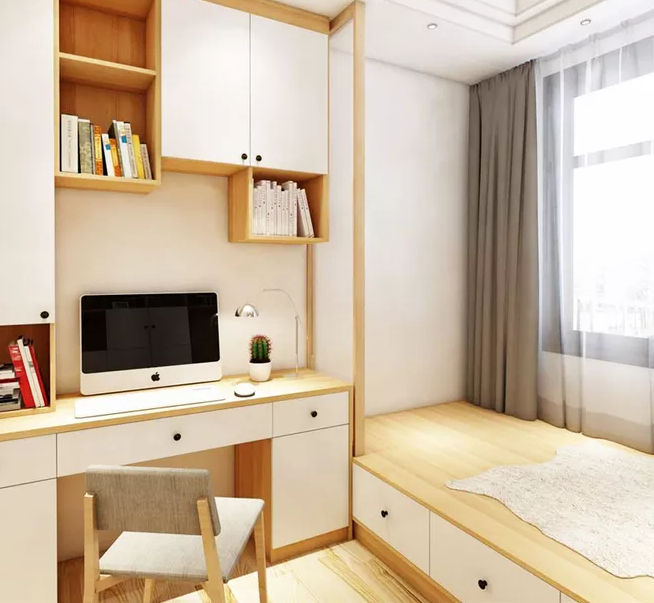 榻榻米可以成为床,下面可以成为收纳空间。在小面积的卧室中,把榻榻米和衣柜、书桌做成一体式的家具,一个简易却实用的小卧室就有了。不管是做儿童房还是客卧,或者是小书房还是储藏室,都是对于小户型来说,都是很重要的。