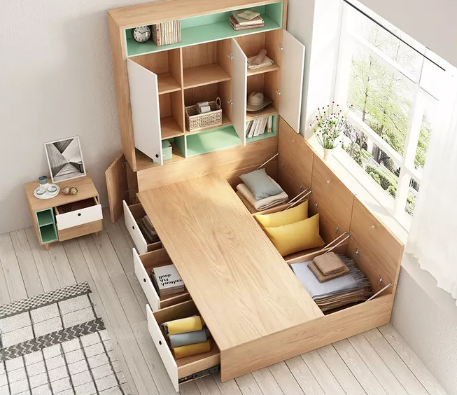 榻榻米的空间要合理的安排,可以分为常用的和不常用的。不常用的可以直接放在榻榻米下面,拿取都有点麻烦;常用的东西可以在外侧设计抽屉,这样拿取就会方便些。