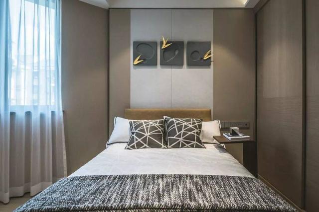 床尾定制了悬挂式台面,相邻了鞋面墙体定制嵌入式衣柜,实用又美观。