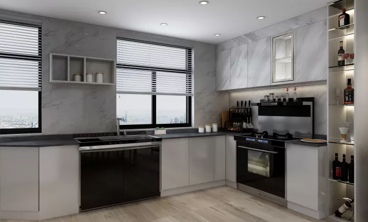 3、厨房的照明问题大家要注意,如果光线暗黑,洗菜的时候可能看不清菜根及叶子间泥土,不知道洗没洗干净,还有是切菜的时候,阴影遮挡,随时有切伤自己的危险,所以厨房的亮度要足够,光有一个吸顶灯可能不太好,在吊柜的下面也要合理的安排灯光,也可以在顶面安装部分筒灯,不仅看起来美观,而且实用性也高,但是要注意一点,如果需要安装吊柜下面的条灯或筒灯,要在合适的位置预留线管和插座等,防止后期收到限制,无法安装。