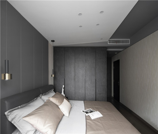 主卧以灰色与白色为主调,营造冷静优雅的空间氛围。倾斜天花板让整个主卧显得与众不同,也让空间更为生动。整面墙的衣柜设计充分满足衣物收纳需求,同为灰调的衣柜柜门尽显和谐与宁静。