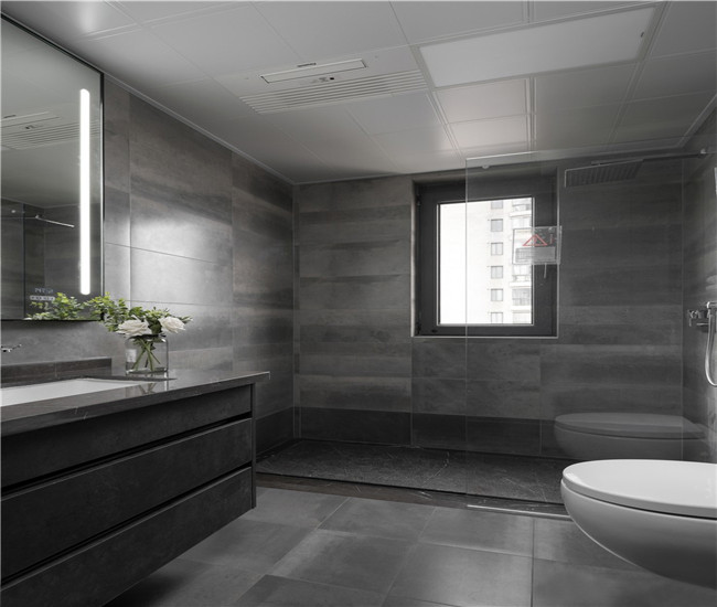 卫生间墙地面铺设灰色系瓷砖,利用色调的深浅变化使空间更有层次。浴室柜灰色大理石台面增添高级质感,整体以柔和的灯光做辅助,营造低奢简约的氛围。