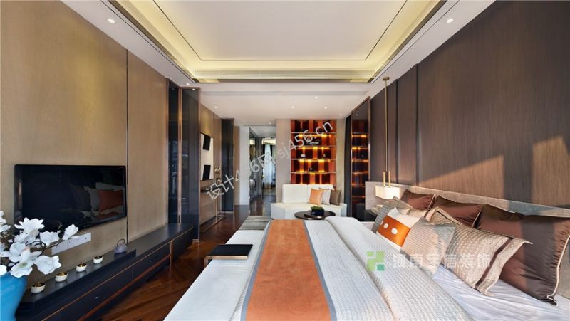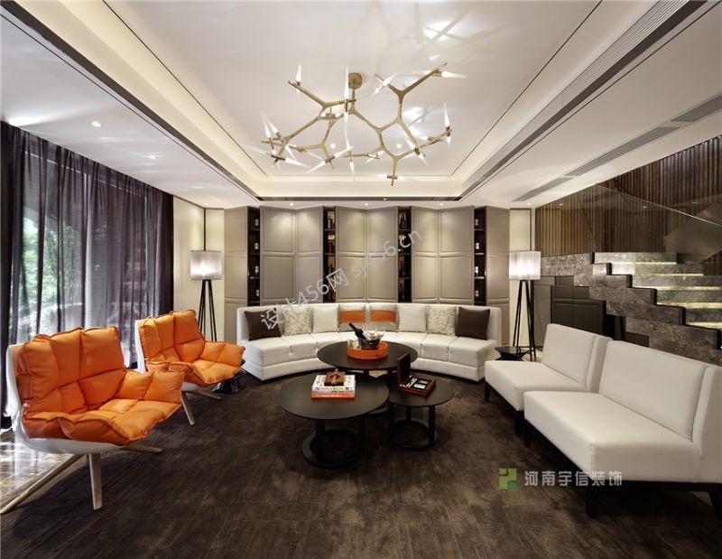 设计理念: 室内空间保留了原有会客厅近7米中空,不仅恢弘大气,亦通过隔断将两层空间巧妙连接,使梯间走廊相得益彰。餐厅茶室位置遵循国人的生活习俗又结合当代审美升华创作,开放式厨房,与餐厅茶室三位一体,我们或许可以看到这样一个场景,妻子朋友在厨房交流烹煮,丈夫家长在茶室品茗闲聊,花园里孩童天真无邪的嬉笑玩闹,这不管在空间的表现力还是生活感染力上,都实现了高度统一。由透明玻璃扶手为过渡,并以流线型手法在木饰上面加以装点,在一步一景的趣味中到达负一层红酒区和健身房,户外花园映入斑驳阳光,惬意流连。超大的SPA区设有泡浴和桑拿,玛瑙玉对纹铺贴,尽显奢华。老人房设于一楼,起居方便;保姆房设有独立卫生间,并连通引入天光的工作间,设计如此人性,使我们仿佛能体会到一家人的其乐融融的感动。二楼的女儿房活泼动感,用色大胆,并设计有独立卫生间和景观书房,可谓细心周到。主人房南北对流,超大卧室干湿分区,落地浴缸,凭窗远眺,可观流溪河之气象万千。在此空间塑造中,设计师以现代人的生活方式融入东方气质美学营造意境,并尝试用跳跃的色彩和时尚审美融入具有人文底蕴的简约中式风格之中,生活细节的精到把握,又于共生中见生活美意。 室内空间保留了原有会客厅近7米中空,不仅恢弘大气,亦通过隔断将两层空间巧妙连接,使梯间走廊相得益彰。餐厅茶室位置遵循国人的生活习俗又结合当代审美升华创作,开放式厨房,与餐厅茶室三位一体,我们或许可以看到这样一个场景,妻子朋友在厨房交流烹煮,丈夫家长在茶室品茗闲聊,花园里孩童天真无邪的嬉笑玩闹,这不管在空间的表现力还是生活感染力上,都实现了高度统一。由透明玻璃扶手为过渡,并以流线型手法在木饰上面加以装点,在一步一景的趣味中到达负一层红酒区和健身房,户外花园映入斑驳阳光,惬意流连。超大的SPA区设有泡浴和桑拿,玛瑙玉对纹铺贴,尽显奢华。老人房设于一楼,起居方便;保姆房设有独立卫生间,并连通引入天光的工作间,设计如此人性,使我们仿佛能体会到一家人的其乐融融的感动。二楼的女儿房活泼动感,用色大胆,并设计有独立卫生间和景观书房,可谓细心周到。主人房南北对流,超大卧室干湿分区,落地浴缸,凭窗远眺,可观流溪河之气象万千。在此空间塑造中,设计师以现代人的生活方式融入东方气质美学营造意境,并尝试用跳跃的色彩和时尚审美融入具有人文底蕴的简约中式风格之中,生活细节的精到把握,又于共生中见生活美意。