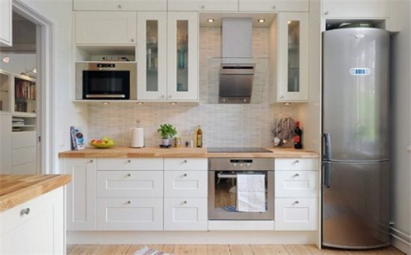 厨房格局如何装修设计?类似这款厨房装修效果图,常见的就当属一字型了。一字型的厨房操作台,一般在小户型或狭长的户型里比较常见,因为房子面积不大,操作台空间也相对较小,紧凑的一字型操作台,可以做成开放式的厨房空间,炒好的菜可以直接端到餐桌上放着,整体空间更加宽敞实用舒适。