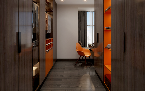 衣帽间以沉稳的深木色为主,突出质感。搭配爱马仕橙点亮空间,注入时尚活力感。