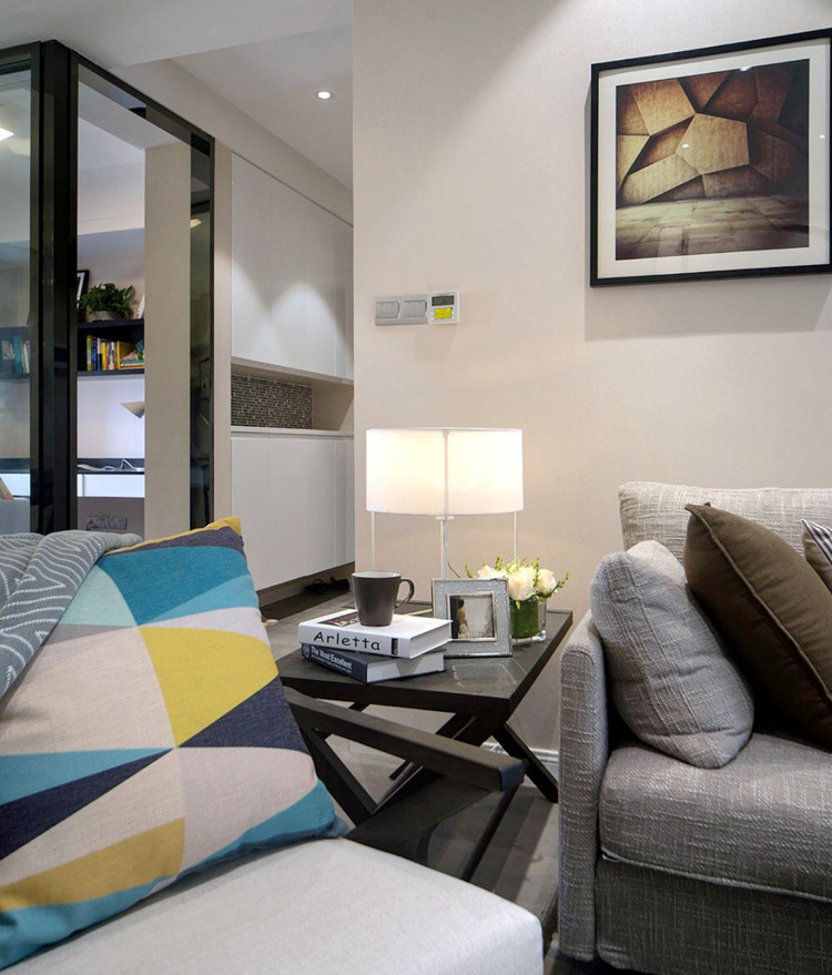 基于明朗又不失沉稳的原则,在对沙发抱枕的选择上,选取了样式不同的中性色抱枕。这样的组合,在视觉上更加舒适;配合而茶几上的摆花,则显得十分温馨。