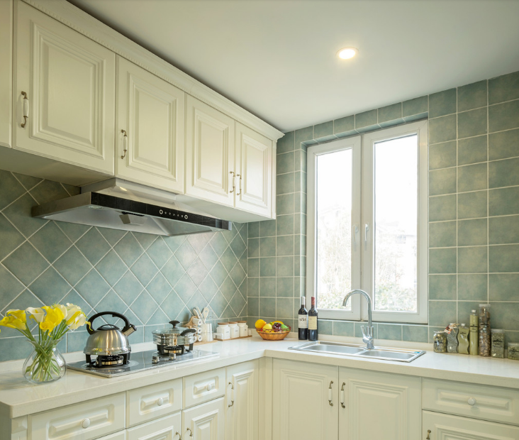 厨房使用了蓝灰色系的复古砖,搭配白色橱柜,简洁明亮